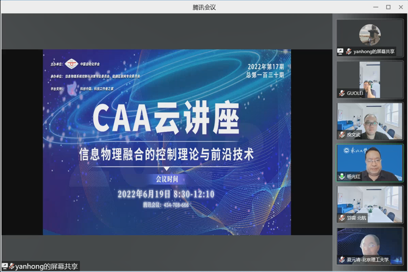 為更好地探討國(guó)際學(xué)術(shù)前沿研究、把握新一輪技術(shù)和產(chǎn)業(yè)變革先機(jī),提升我國(guó)科技創(chuàng)新水平,由中國(guó)自動(dòng)化學(xué)會(huì)主辦,中國(guó)自動(dòng)化學(xué)會(huì)信息物理系統(tǒng)控制與決策專業(yè)委員會(huì)和中國(guó)自動(dòng)化學(xué)會(huì)能源互聯(lián)網(wǎng)專業(yè)委員會(huì)共同承辦的CAA云講座“信息物理融合的控制理論與前沿技術(shù)論壇”于2022年6月19日以線上線下混合會(huì)議的形式在東北大學(xué)開展并取得圓滿成功,論壇特邀了北京航空航天大學(xué)郭雷教授、北京理工大學(xué)夏元清教授、華中科技大學(xué)曾志