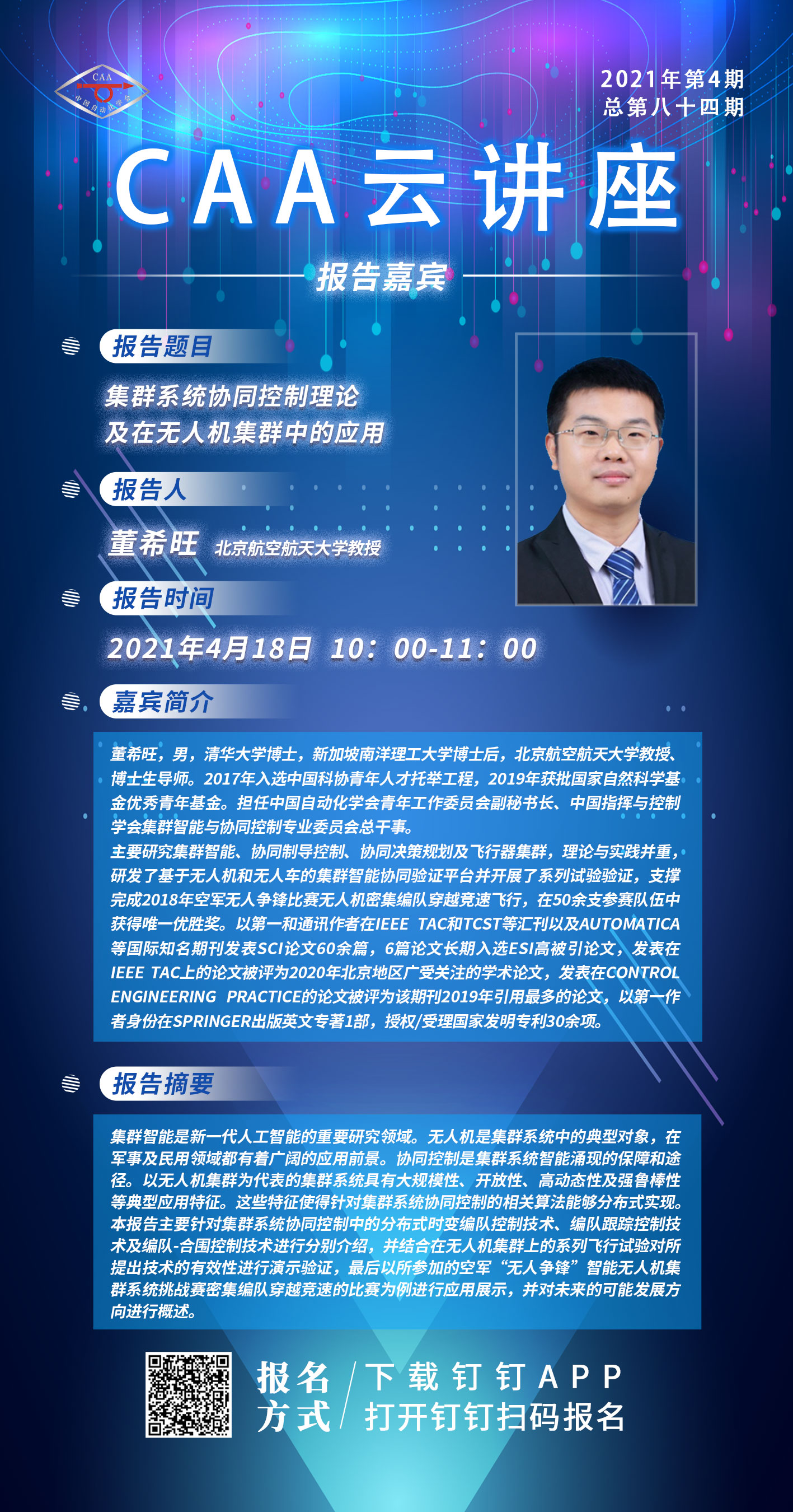 2021年中國自動化學會第四期云講座將于2021年4月18日10:00-11:00開講,本期云講座邀請到北京航空航天大學教授董希旺,為大家帶來報告:集群系統協同控制理論及在無人機集群中的應用,敬請期待!