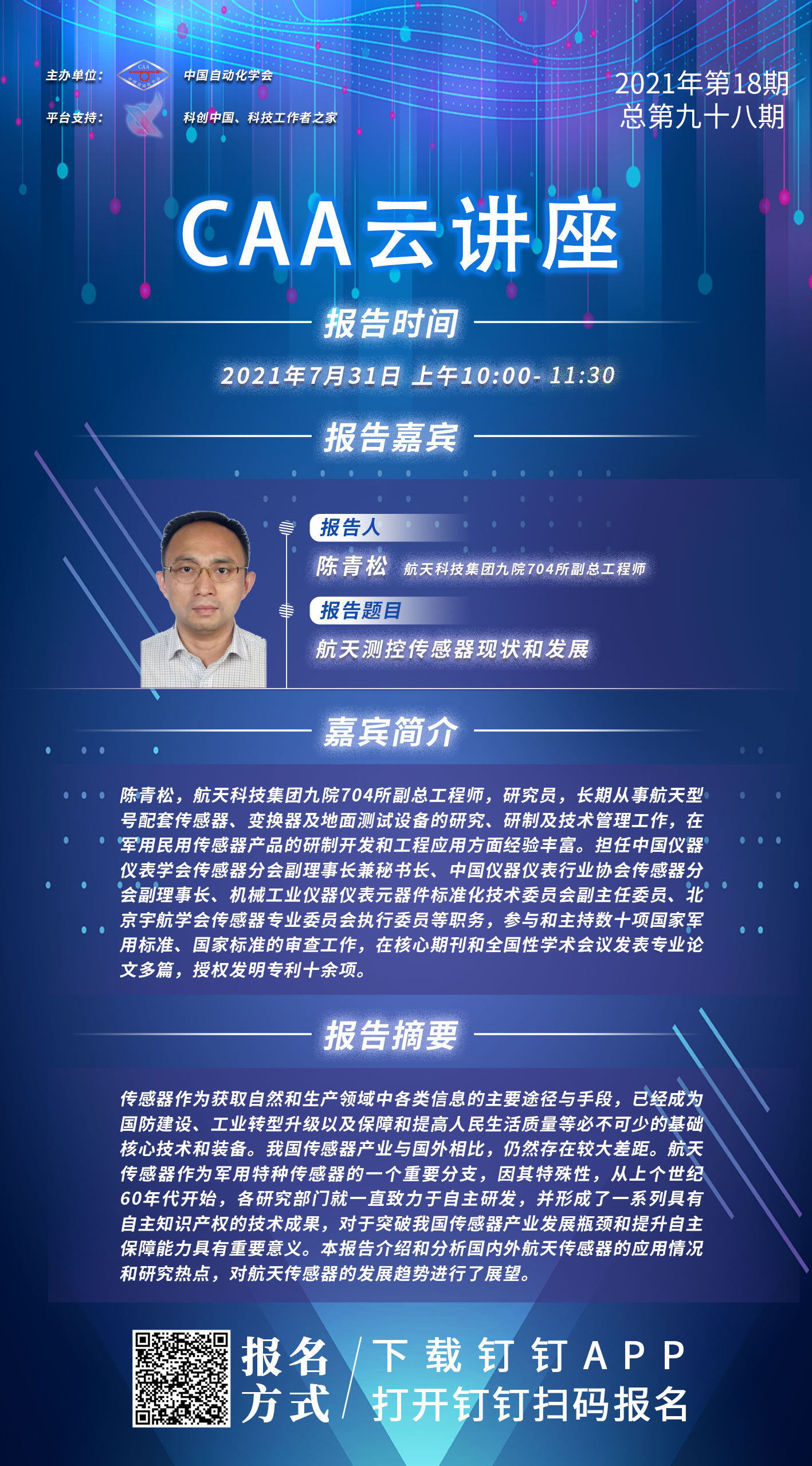 2021年中國自動(dòng)化學(xué)會(huì)第十八期云講座將于7月31日10:00-11:30開講,本期云講座邀請到航天科技集團(tuán)九院704所副總工程師陳青松,為大家?guī)韴?bào)告:航天測控傳感器現(xiàn)狀和發(fā)展。精彩內(nèi)容,敬請期待!