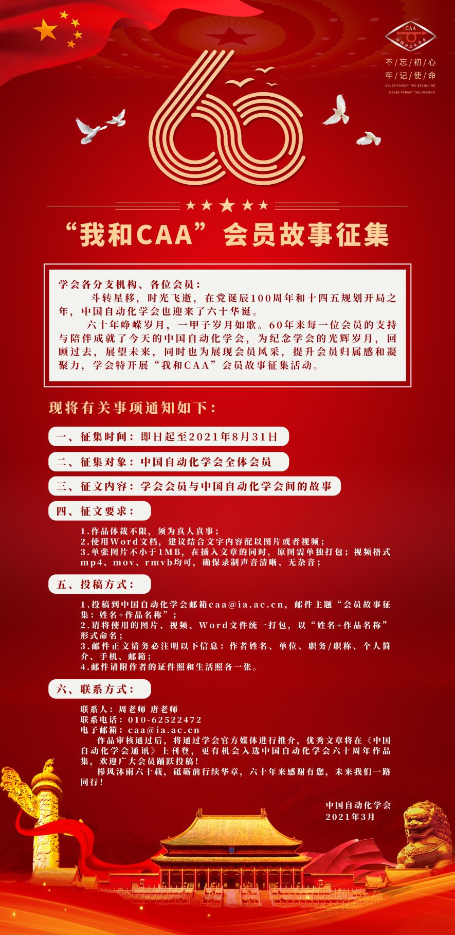 六十年崢嶸歲月,一甲子歲月如歌。60年來每一位會員的支持與陪伴成就了今天的中國自動化學會,為紀念學會的光輝歲月,回顧過去,展望未來,同時也為展現(xiàn)會員風采,提升會員歸屬感和凝聚力,學會特開展“我和CAA”會員故事征集活動。