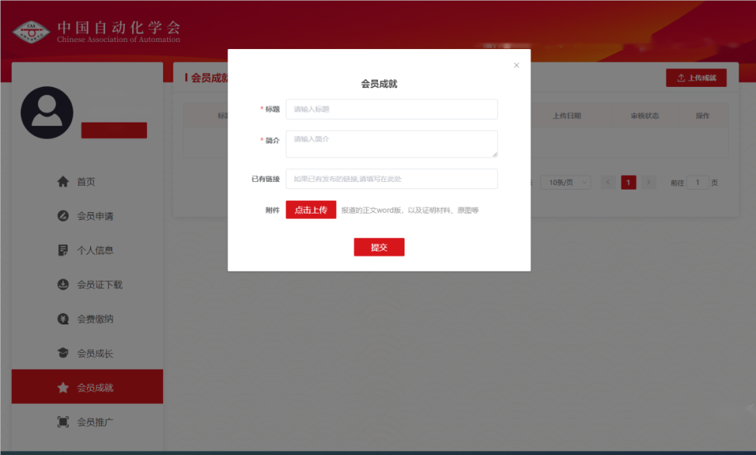 選擇“會員成就”欄目,填寫成就標題、簡介,上傳附件材料,如有公開鏈接可一并上傳。