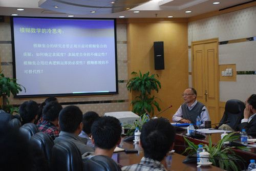 李德毅院士針對(duì)“不確定性表示的數(shù)學(xué)基礎(chǔ)”,“云模型及其數(shù)學(xué)性質(zhì)”,“云模型應(yīng)用”三個(gè)方面做了學(xué)術(shù)性的座談,并在互動(dòng)環(huán)節(jié)為在場(chǎng)的老師和同學(xué)解答疑問(wèn),精彩的論述贏得了陣陣掌聲。
