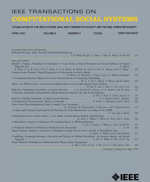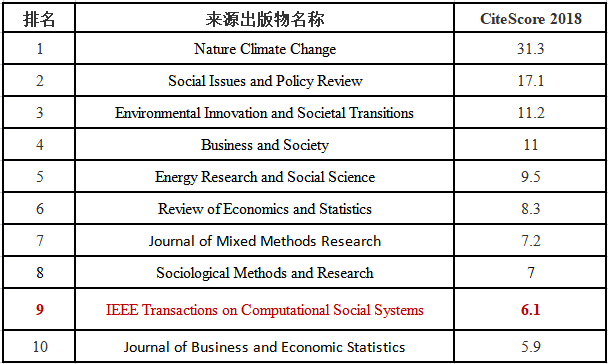 據Elsevier近日發布的期刊影響力榜單,IEEE TCSS在2020年的CiteScore再創新高,達到6.1,較2018年的2.5和2019年的3.9有顯著的增長。從CiteScore排名來看,IEEE TCSS在“社會科學”學科類別的334個學術出版物中排名第9位,排名居前3%;在“建模與模擬”學科類別的274個學術出版物和“人機交互”學科的108個學術出版物中排名分別為第62位和第38位,位居前23%和前35%。