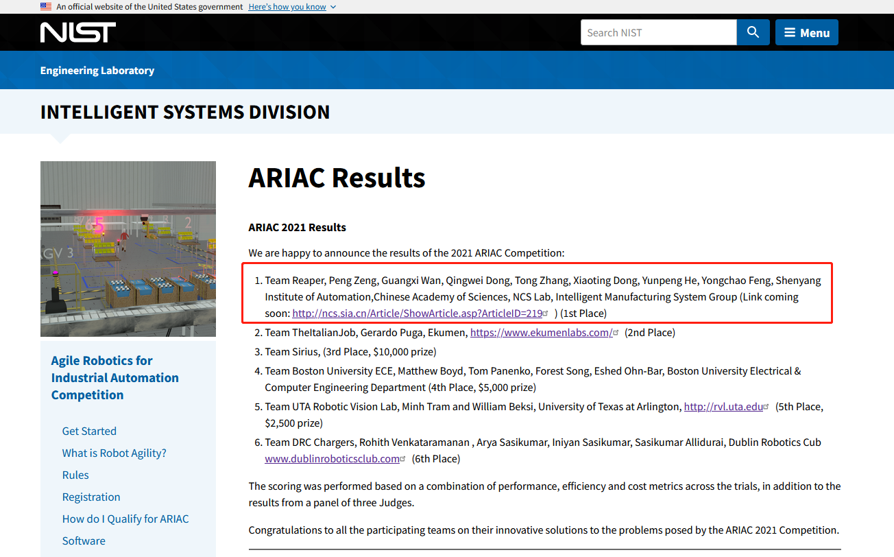 7月15日,由美國國家標(biāo)準(zhǔn)與技術(shù)研究院(簡稱NIST)舉辦的2021年度面向工業(yè)自動化的敏捷機器人集群國際挑戰(zhàn)賽(Agile Robotics for Industrial Automation Competition,簡稱ARIAC)發(fā)布了比賽結(jié)果,經(jīng)過初賽、決賽二輪激烈角逐,中國科學(xué)院沈陽自動化研究所工業(yè)控制網(wǎng)絡(luò)與系統(tǒng)研究室邊緣計算與邊緣智能課題組萬廣喜、董青衛(wèi)、張通、董曉婷、賀云鵬、馮勇超組成的Reaper團(tuán)隊,在參賽的60余支代表隊中脫穎而出,榮獲冠軍。Ekumen實驗室的TIJob團(tuán)隊、Denbar Robotics機器人研究中心Sirius團(tuán)隊、波士頓大學(xué)ECE團(tuán)隊、德克薩斯大學(xué)UTA Robotic Vision Lab團(tuán)隊和Dublin機器人俱樂部DRC Chargers團(tuán)隊分獲2-6名。