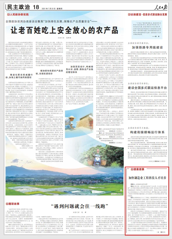 2021年7月22日,《人民日報》以《加快制造業工程科技人才培養》為題,刊登了全國政協委員,上海市政協副主席,九三學社上海市委主委,中國自動化學會會士、監事錢鋒的《關于智能化時代制造業工程科技人才培養模式改革的提案(3544號)》的提要,此提案獲得“全國政協2020年度好提案”稱號。