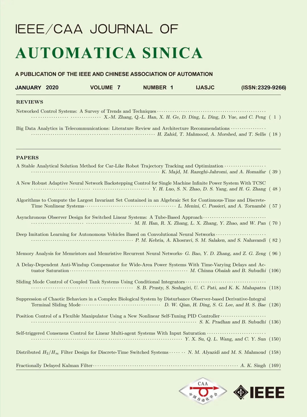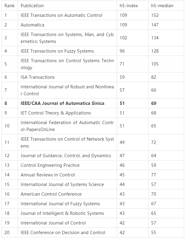 近日,谷歌學(xué)術(shù)出版物影響力榜單——學(xué)術(shù)計量指標(biāo)(Scholar Metrics) 2021版發(fā)布。IEEE/CAA Journal of Automatica Sinica穩(wěn)居工程和計算機科學(xué)領(lǐng)域的自動化與控制理論學(xué)科頂級出版物(Top Publications)榜單,h5指數(shù)為51,排名躍升至第8,首次進入全球前十,是該學(xué)科TOP20出版物中世界最年輕且唯一中國主辦的期刊。 谷歌學(xué)術(shù)計量基于學(xué)術(shù)出版物過去五年的h指數(shù)計算,綜合考慮發(fā)文量和被引量,具有不易操控、范圍廣泛等特點,是出版物重要學(xué)術(shù)評價指標(biāo)之一,自2012年起每年發(fā)布一次。谷歌學(xué)術(shù)表示,該計量指標(biāo)為快速評估學(xué)術(shù)出版物近年發(fā)表文章的顯示度和影響力提供了一種便捷方式。 谷歌學(xué)術(shù)計量指標(biāo)含義:h指數(shù)(h-index):出版物所發(fā)表的 h 篇文章每篇至少都被引用 h 次。h指數(shù)越高,表明期刊影響力越大。h5指數(shù)(h5-index):出版物過去五年所發(fā)表文章的h指數(shù)。h5中位數(shù)(h5-median):出版物h5指數(shù)所涵蓋文章的引次中位值。