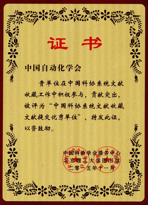 為推動科技成果轉化,建設中國科協重點技術領域專利信息庫,服務企業增強技術創新能力,中國科學技術咨詢服務中心啟動了“企業科學技術服務——科技文獻信息加工(重點技術領域專利信息深度加工與翻譯標引)”項目。中國自動化學會在中國科協系統文獻收藏工作中積極參與,貢獻突出,被評為“中國科協系統文獻收藏文獻提交優秀單位”。