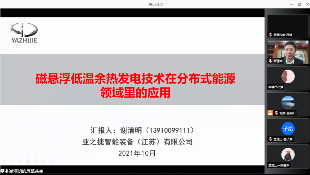 亞之捷智能裝備(江蘇)有限公司謝清明總經理作題為“磁懸浮低溫余熱發電技術在分布式能源領域里的應用”的報告。報告指出磁懸浮低溫余熱發電技術可以將蒸汽輪機無法回收的工業廢熱回收發電。產品采用先進的永磁偏置磁懸浮軸承技術、高效向心渦輪技術、高速永磁同步電機及控制技術、高效復疊循環利用技術和多領域半實物仿真技術,具有高效率、免維護、長壽命等特點。該產品通過將工業低溫廢熱與有機工質換熱,形成高壓有機工質蒸氣,吹動渦輪做功發電。并指出該技術是分布式能源技術的一個重要發展方向,既能變廢為寶,又能減少排放,產品在不改變用戶原生產工藝的前提下,進行廢熱回收,可以廣泛適用于高能耗行業。