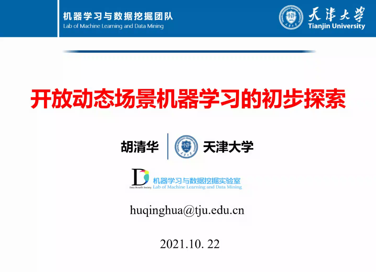 胡清華教授的報(bào)告題目是“開放動(dòng)態(tài)場(chǎng)景機(jī)器學(xué)習(xí)的初步探索”。胡教授首先介紹研究背景,指出目前機(jī)器學(xué)習(xí)適用于固定封閉環(huán)境,當(dāng)面臨開放動(dòng)態(tài)場(chǎng)景時(shí),多模態(tài)數(shù)據(jù)存在較強(qiáng)不確定性、關(guān)聯(lián)關(guān)系存在動(dòng)態(tài)變化,數(shù)據(jù)呈現(xiàn)長(zhǎng)尾分布而尾部不易建模,測(cè)試過(guò)程中新樣本不斷涌現(xiàn),樣本多樣性和多樣性對(duì)抗策略使模型失效。針對(duì)上述問(wèn)題,胡教授介紹最近的研究重點(diǎn)及成果,包括多模態(tài)數(shù)據(jù)動(dòng)態(tài)融合、長(zhǎng)尾數(shù)據(jù)的多粒度遷移學(xué)習(xí)、開放場(chǎng)景的自主學(xué)習(xí)和選擇則性資助學(xué)習(xí)。