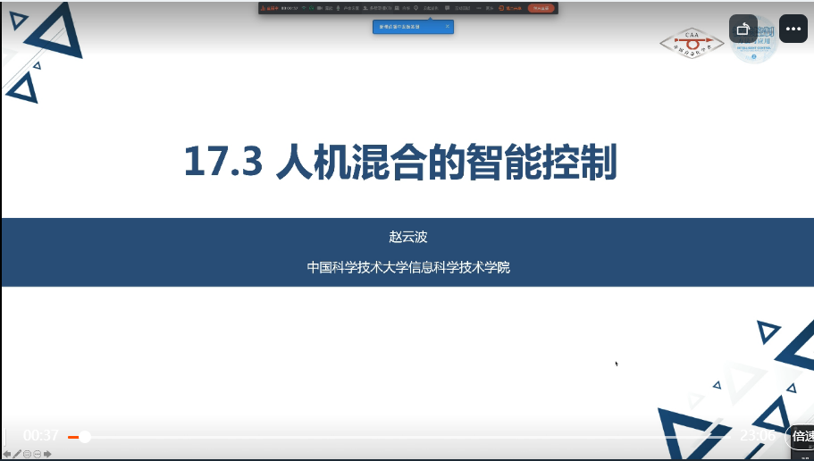 趙云波教授講解的章節是《人機混合的智能控制》。趙教授在報告中首先闡述了控制系統、機器和人的關系,然后介紹了人機混合智能控制的基恩概念,最后重點講解了人在回路的控制和人機協同控制。