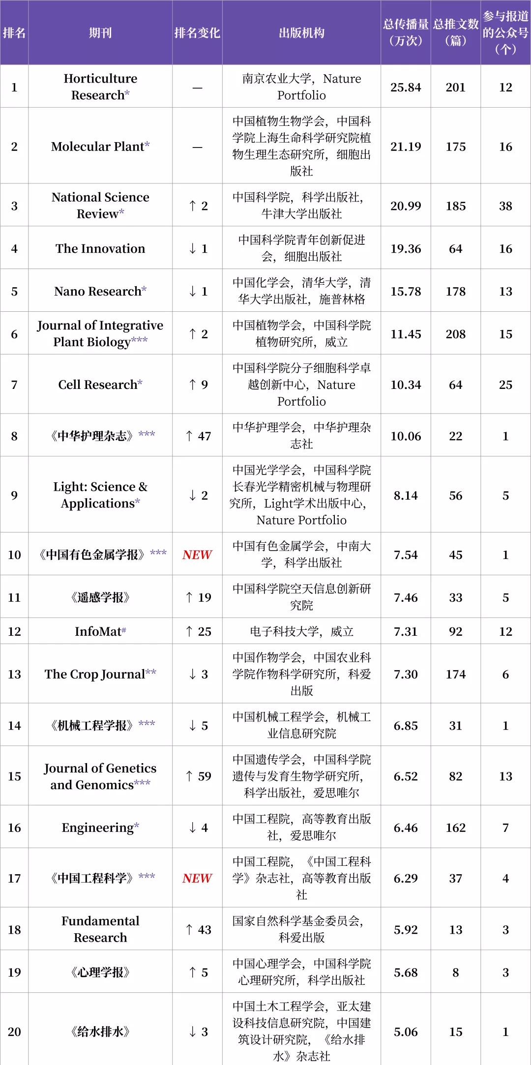 學術期刊微信傳播力榜作為衡量學術期刊新媒體影響力的榜單,動態追蹤中國學術期刊和全球學術期刊在微信平臺的傳播情況,定期盤點最具傳播力的學術期刊,為評價期刊的社會影響力提供一個新的參考維度。