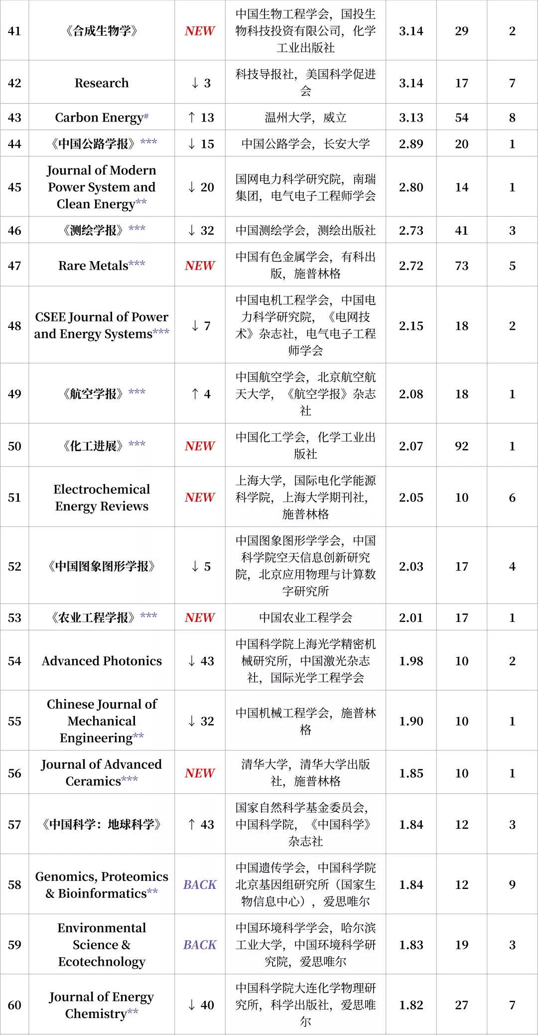 注 :英文期刊以其英文名稱表示,中文期刊以其中文名稱表示。入選“中國科技期刊卓越行動計劃“的期刊,在其名稱的右上角以特殊符號進行標記,分別為*(領軍期刊)、**(重點期刊)、***(梯隊期刊)、#(高起點新刊)。