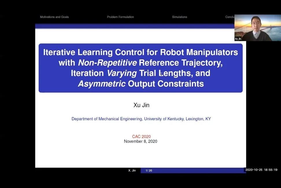 最后,美國肯塔基大學金旭助理教授通過視頻做了“ILC for Manipulators with Non-Repetitive References, Varying Trial Lengths, and Asymmetric Output Constraints”的專題報告。報告提出了一種新的迭代學習控制(ILC)方案,以解決機器人在不同試驗長度的迭代域上的非重復參考軌跡跟蹤問題,同時考慮到關節角不對稱的約束。為了解決迭代長度變化的問題,給出了一種新的迭代學習控制律結構,即基于復合能量函數的迭代學習控制律,介紹了一種新的處理關節角度約束的通用勢壘函數。最后,通過一個二自由度機械手的例子對所提方法進行論證并對該研究方向予以展望。