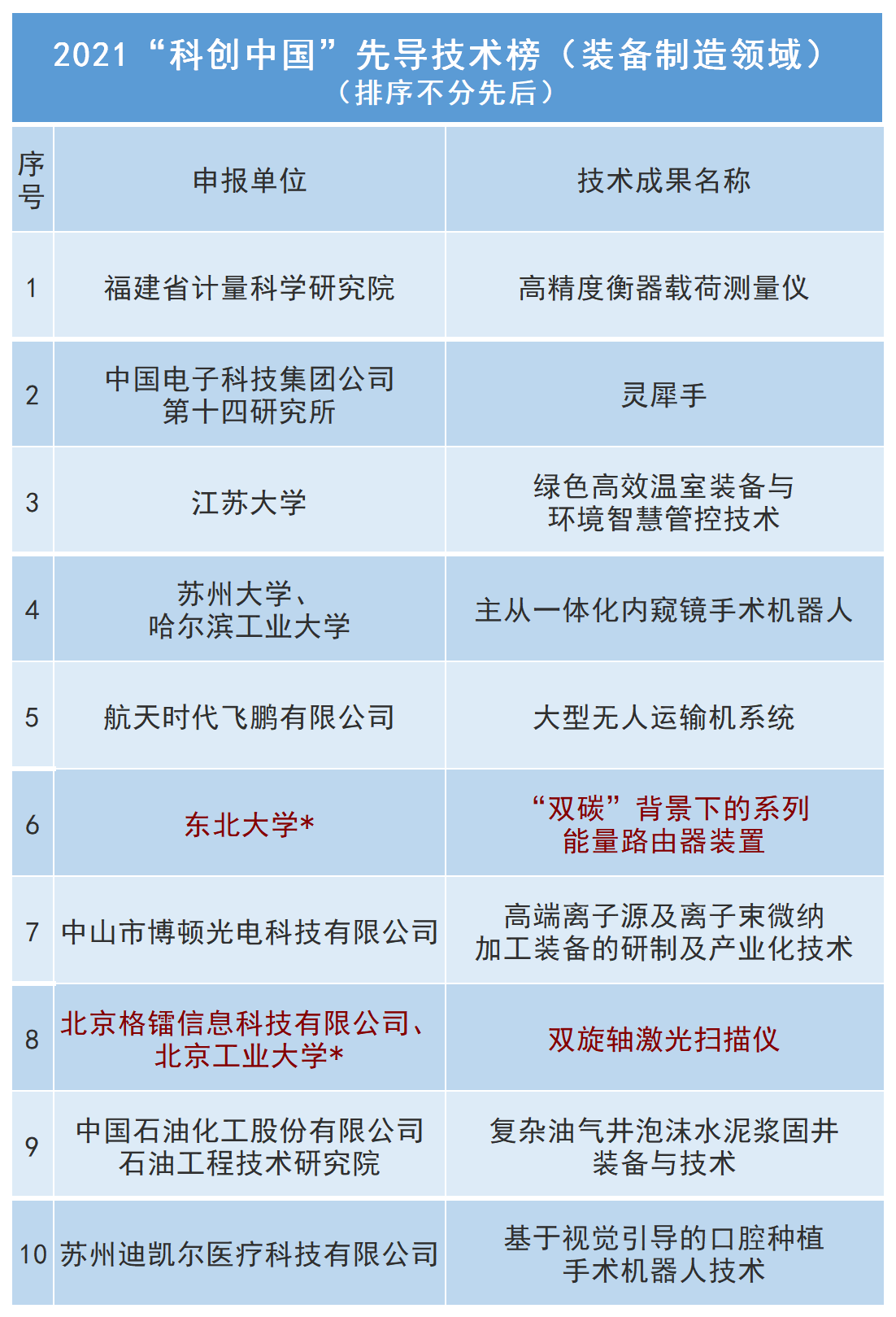 2021“科創中國”榜單經初評、終評,遴選出“先導技術榜”100項、“突破短板關鍵技術榜(裝備制造領域)”10項、“新銳企業榜”100項、“產學研融通組織榜”10項、“科技創業投資機構榜”10項、“開源創新榜”遴選64項、“青年創業榜”遴選90項,共計384項擬入榜項目。
