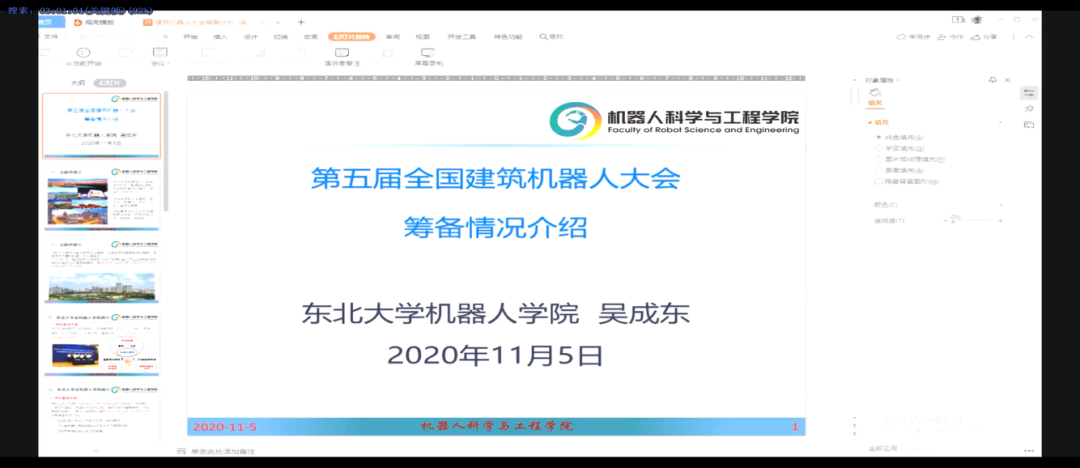 而后,東北大學吳成東教授帶來報告:《第五屆全國建筑機器人大會的籌備情況介紹》,報告介紹了沈陽市的基本情況和東北大學機器人學院的科研平臺和實驗條件的建設情況,匯報了關于第五屆全國建筑機器人大會各項工作的時間安排和籌備情況并聽取了各位專家對于大會的各項建議。吳教授最后代表東北大學機器人學院對即將參會的各位研究者表示熱烈歡迎和殷切期望。