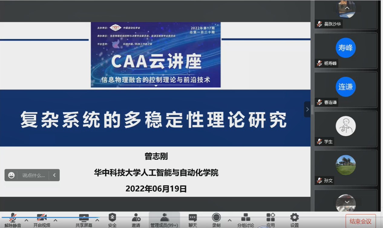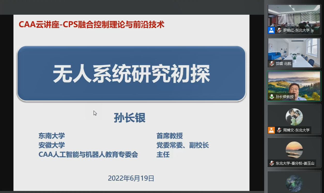 為更好地探討國際學術前沿研究、把握新一輪技術和產業變革先機,提升我國科技創新水平,由中國自動化學會主辦,中國自動化學會信息物理系統控制與決策專業委員會和中國自動化學會能源互聯網專業委員會共同承辦的CAA云講座“信息物理融合的控制理論與前沿技術論壇”于2022年6月19日以線上線下混合會議的形式在東北大學開展并取得圓滿成功,論壇特邀了北京航空航天大學郭雷教授、北京理工大學夏元清教授、華中科技大學曾志剛教授、安徽大學孫長銀教授和東南大學虞文武教授作專題報告,線上線下同步觀看近八萬人次。中國自動化學會信息物理系統控制與決策專業委員會主任楊光紅教授和中國自動化學會能源互聯網專業委員會主任張化光教授共同擔任本次論壇主席,東北大學智能科學與技術研究院副院長楊東升教授擔任論壇組織主席,報告主持人分別由東北大學楊東升教授、羅艷紅研究員、王占山教授、葉丹教授和周博文副教授擔任。