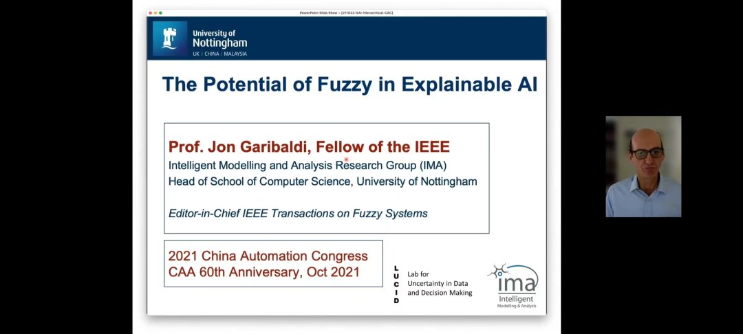 諾丁漢大學計算機科學學院院長Jon Garibaldi帶來線上報告“The Potential of Fuzzy in Explainable AI”,重點介紹了基于模糊規(guī)則的推理以及模糊集和模糊系統(tǒng)的一些基礎知識和技術,闡述了這些技術如何在尋求人類可以理解的人工智能系統(tǒng)——可解釋AI中發(fā)揮作用。此外,介紹了一些關于使用先進模糊技術解決決策問題建模的當前研究,詳細闡述了分層模糊系統(tǒng)(包含多個自包含模糊子系統(tǒng)的模糊系統(tǒng)),以及如何有助于創(chuàng)建可解釋AI。