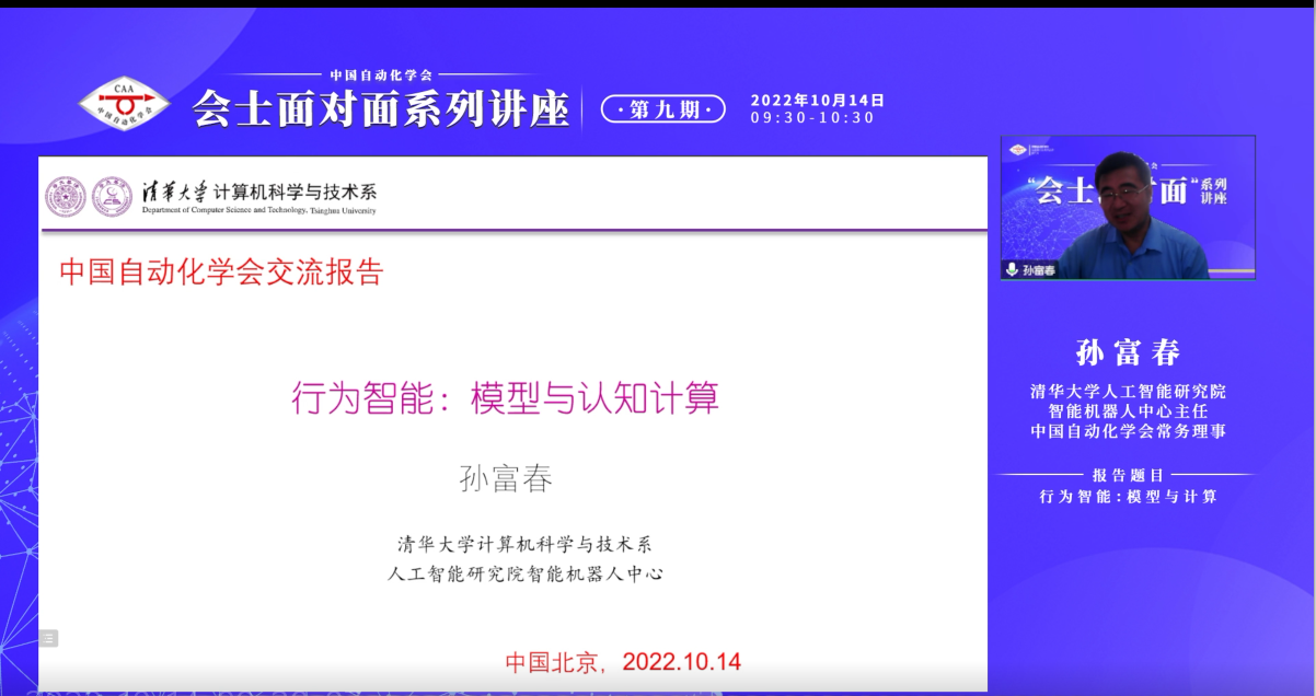第九期會士面對面講座于2022年10月14日上午成功召開,中國自動化學會常務理事、會士、清華大學計算機科學與技術系長聘教授委員會副主任孫富春教授作題為“行為智能:模型與計算”的報告。