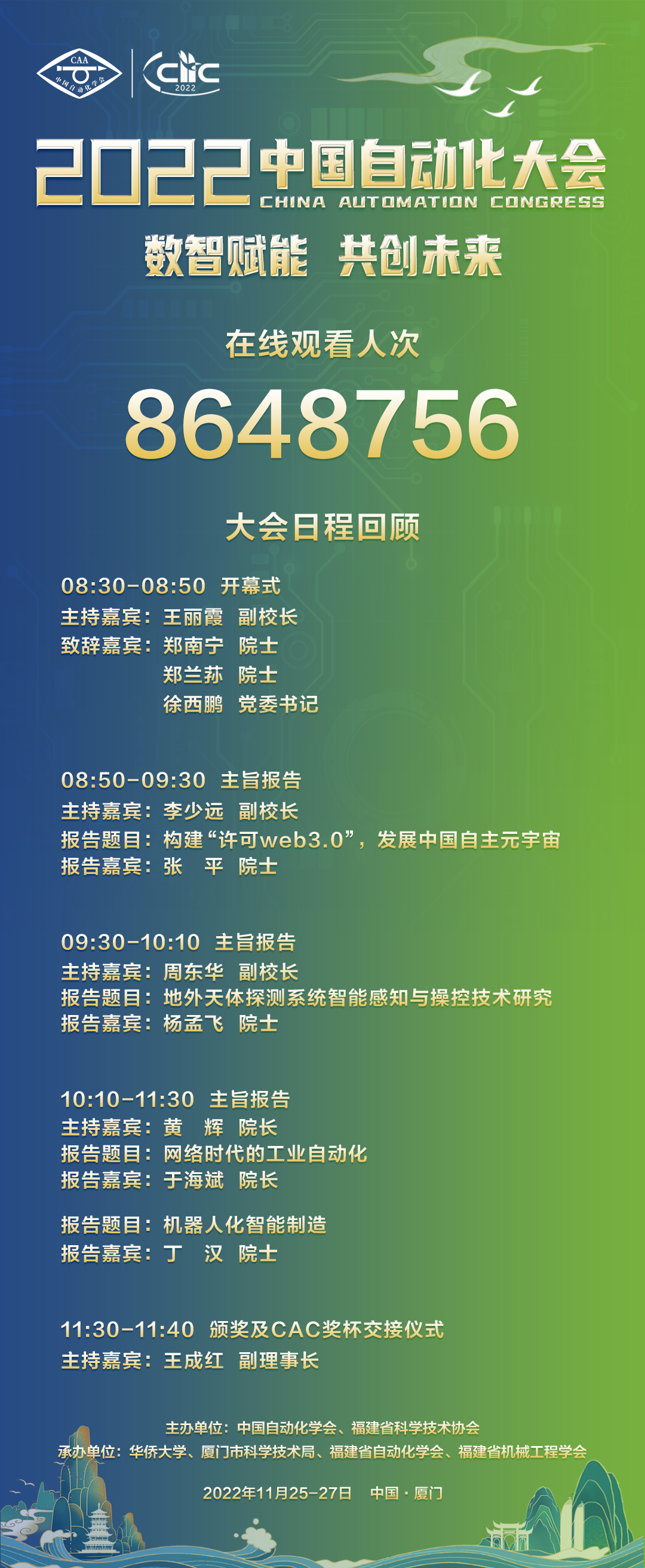 大會總主席、中國工程院院士、中國自動化學會理事長、西安交通大學教授鄭南寧,中國工程院院士、中國自動化學會特聘顧問、中國科學院沈陽自動化所研究員王天然,中國工程院院士、中國自動化學會副理事長、中南大學教授桂衛華,中國科學院院士、福建省科學技術協會主席鄭蘭蓀,中國工程院院士、北京郵電大學教授張平,中國科學院院士、中國自動化學會副理事長、中國空間技術研究院研究員楊孟飛,中國科學院院士、華中科技大學教授丁漢,中國工程院院士、中國自動化學會副理事長、同濟大學校長陳杰,華僑大學黨委書記徐西鵬,中國自動化學會監事長、中國科學院自動化所研究員王飛躍,中國自動化學會副理事長王成紅,中國自動化學會副理事長、中國科學院沈陽分院院長于海斌,中國自動化學會副理事長、上海交通大學教授、青島科技大學副校長李少遠,中國自動化學會副理事長、山東科技大學副校長周東華,中國自動化學會副理事長、華南理工大學教授陳俊龍,中國自動化學會副理事長、冶金設計研究院有限公司院長、中國鋼研科技集團有限公司黨委副書記張劍武,中國自動化學會副理事長、中國科學院自動化所研究員侯增廣,中國自動化學會副理事長、中國科學院數學與系統科學研究院研究員張紀峰,福建省科學技術協會二級巡視員楊采薇,廈門市科技局局長孔曙光等以線上線下方式出席會議。