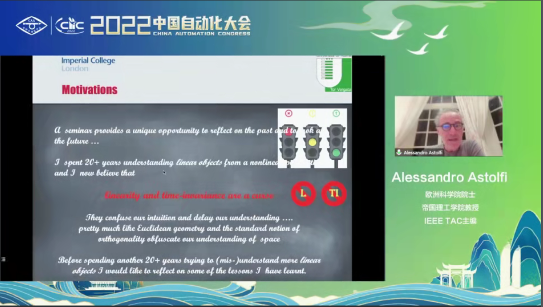 歐洲科學院院士、帝國理工學院教授、IEEE TAC主編Alessandro Astolfi作題為“The curse of linearity and time-invariance”的大會報告,報告主要介紹分析了線性時不變系統。