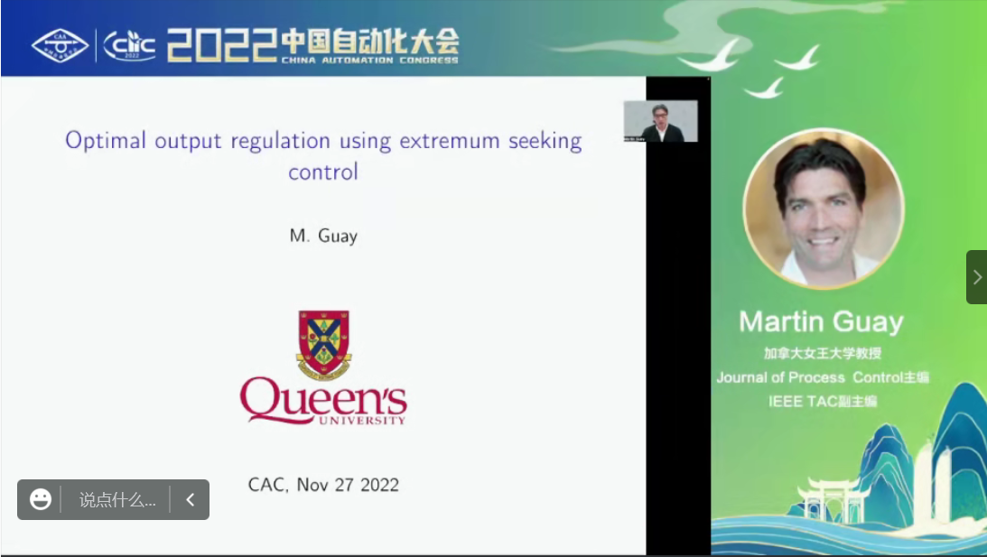 加拿大女王大學教授、Journal of Process Control主編、IEEE TAC副主編Martin Guay作題為“Output regulation of uncertain systems using extremum seeking control“的大會報告。報告主要分享了極值搜索控制如何實現對最優條件的調節,以應對未知環境的影響,同時討論極值搜索控制在高空偽衛星上的具體應用。
