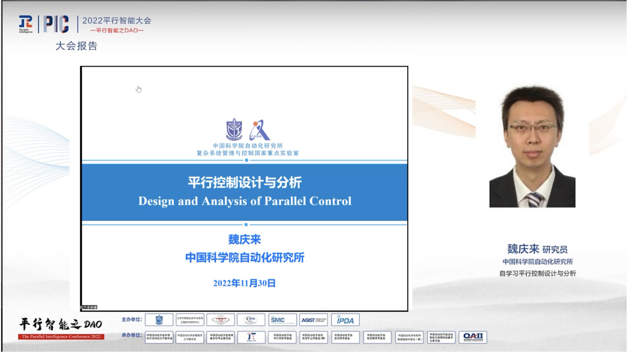 為深入交流平行智能領域的基礎理論、前沿技術、行業應用,跨學科、多領域探討平行智能的落地場景,促進工業到“智業”的發展,11月22日,2022平行智能大會在北京拉開帷幕。本次大會由中國自動化學會會士、監事長,復雜系統管理與控制國家重點實驗室(以下簡稱:實驗室)主任、中國科學院自動化研究所研究員王飛躍擔任主席,中國自動化學會副理事長、實驗室副主任候增廣研究員和閆研正高級工程師共同擔任副主席。大會由中國自動化學會、國際平行駕駛聯盟(iPDA)聯合主辦,由中國自動化學會開源知識自動化工作委員會、中國自動化學會平行控制專委會、中國自動化學會區塊鏈專委會、中國自動化學會智慧礦山專委會、中國自動化學會智慧教育專委會、中國自動化學會系統復雜性專業委員會、中國自動化學會運動智能與高精密裝備專業委員會、青島智能產業技術研究院、IEEE ITSS Beijing Chapter等機構聯合承辦。