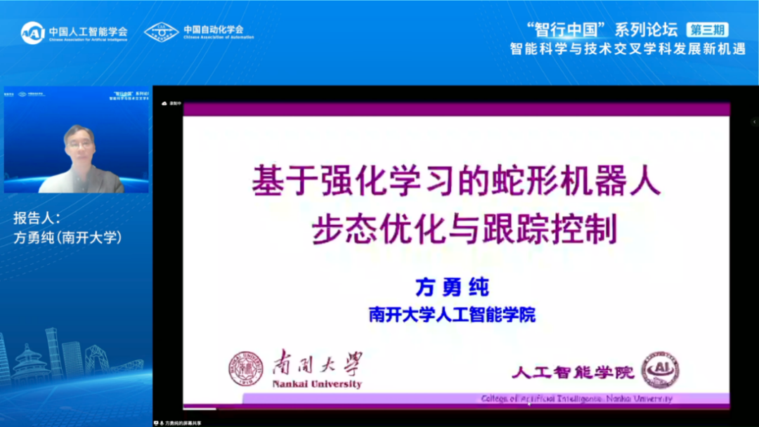 南開大學(xué)研究生院常務(wù)副院長方勇純發(fā)表題為“基于強(qiáng)化學(xué)習(xí)的蛇形機(jī)器人步態(tài)優(yōu)化與跟蹤控制”的主旨報告,他指出與其他機(jī)器人相比,蛇形機(jī)器人可以在狹窄管道等環(huán)境中作業(yè),因此具有廣闊的應(yīng)用前景,步態(tài)優(yōu)化與跟蹤控制是蛇形機(jī)器人實現(xiàn)高效作業(yè)的關(guān)鍵。他基于強(qiáng)化學(xué)習(xí)等方法,就蛇形機(jī)器人的步態(tài)優(yōu)化與控制問題展開論述,具體包括基于強(qiáng)化學(xué)習(xí)的步態(tài)優(yōu)化方法,以及基于強(qiáng)化學(xué)習(xí)的蛇形機(jī)器人跟蹤控制方法。