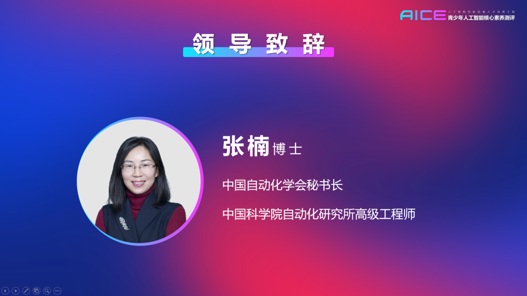 中國自動化學會秘書長張楠博士在總結大會上致辭,她表示,面對人工智能這個尚在發展初期、前沿技術和應用日新月異的領域,青少年人工智能教育該教什么、如何前后銜接、學生在學習上如何逐級遞進,這些是中小學老師們常見的困惑。“青少年人工智能核心素養測評”設計出了清晰合理、不斷與時俱進、優化迭代的核心模型、測評框架及模塊分級,明確了中小學階段人工智能教育的階梯路徑,讓學生和老師都有一個清晰的進階方向。張楠秘書長說,希望青少年人工智能核心素養測評,這個工作越做越好,成為中國人工智能與自動化人才培養的一面旗幟。