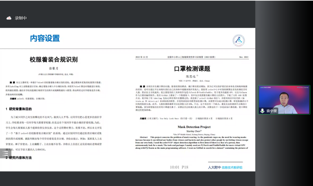 6日下午,大會繼續進行。CAA 普及工作委員會委員張夢晗老師對2022年的AICE測評工作做了總結匯報,并對2023年的規劃做了預告。隨后,2022年AICE四期測評中的優秀學生代表及其輔導老師做了分享。AICE 測評工作組的祝澤程老師講解了AICE進階提高階段D/E 項目的輔導與評審流程,上海市徐匯中學的胡奕銘同學介紹了自己參加測評的人工智能項目,上海愛礪鋒科創中心的黃波曲老師分享了D/E 模塊的輔導經驗,養蕊老師分享了中小學生創新思維及創新技術培養的經驗和心得。
