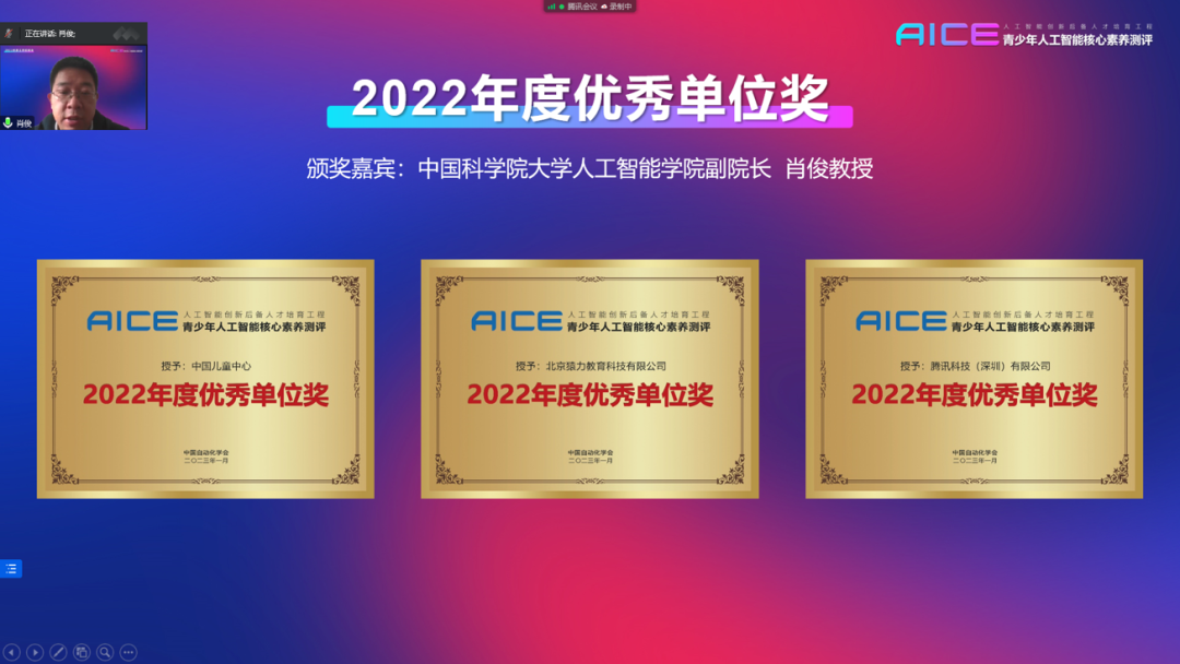 隨后,大會進行了線上頒獎,中國科學院大學人工智能學院的肖俊院長和西安交通大學計算機學院的田峰教授先后宣讀了各個獎項的獲獎名單和獲獎理由(見文末)。任赟、賈志勇、劉俊英等20位老師獲得了AICE年度優秀個人貢獻獎。霍穎怡、徐啟發、馬文杰等20位老師獲得了AICE2022年度優秀輔導師;華中師范大學第一附屬中學、澳門培正中學、北京市八一學校等15家學校被授予AICE2022年度共建特色校;中國兒童中心、北京猿力教育科技有限公司、騰訊科技(深圳)有限公司獲得了AICE測評2022年度優秀單位貢獻獎;三象教育(鯨橋編程)、剡鋒教育、西安運營中心、遼寧運營中心、武漢運營中心等10單位獲得AICE2022年度優秀組織單位獎;徐啟發、任赟、劉俊英三位老師代表獲獎老師和獲獎單位發表了獲獎感言。來自猿編程的劉俊英老師表示,希望培養孩子們的科技視野,讓孩子去關注當前科技的發展,理解科技對于當下和未來的影響,進而具備更廣闊的對于未來科技的視野。