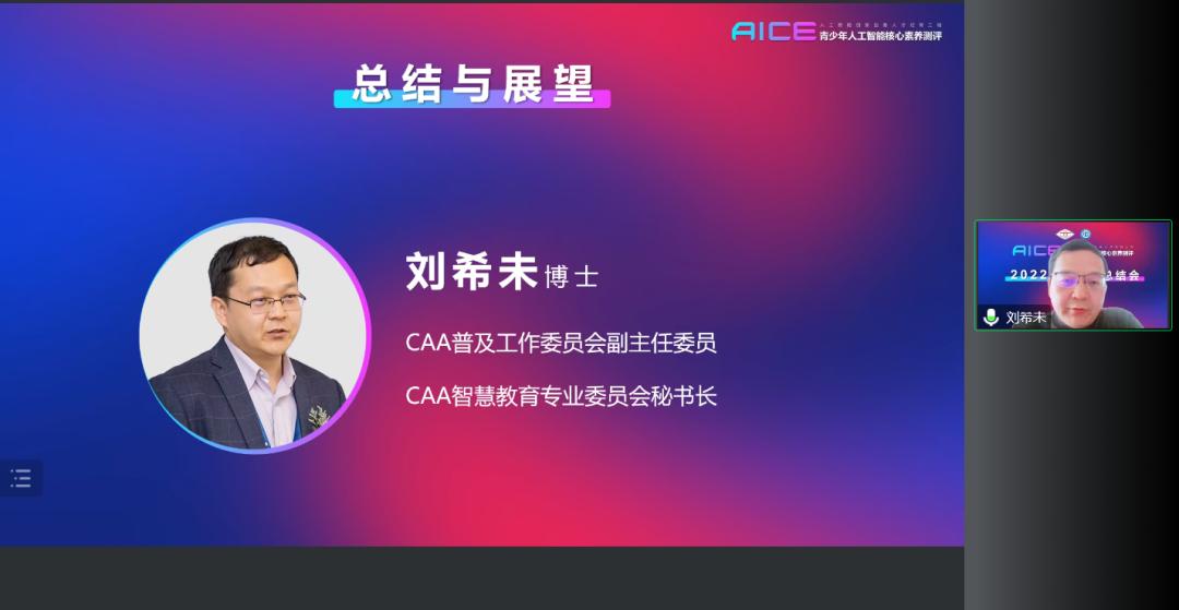 中國自動化學會普及工作委員會副主任委員、中國自動化學會智慧教育專業委員會秘書長、AICE測評工作組組長劉希未博士在頒獎后對獲獎老師和單位作了寄語,他說,期待有更多專家老師和同學們加入到測評中,共同用好測評結論,提升中小學人工智能教育水平。劉希未博士表示,AICE工作組在后續的工作中會積極聽取更多專家和教學一線老師們的建議、要求和批評,在新的一年里扎實推進,持續創新,密切結合全國中小學人工能教育的發展實際,不斷的提升測評工作的科學化、系統化、標準化和規范化,切實為中小學的人工智能教育提升做好基礎性、階梯性和導向性的支持。