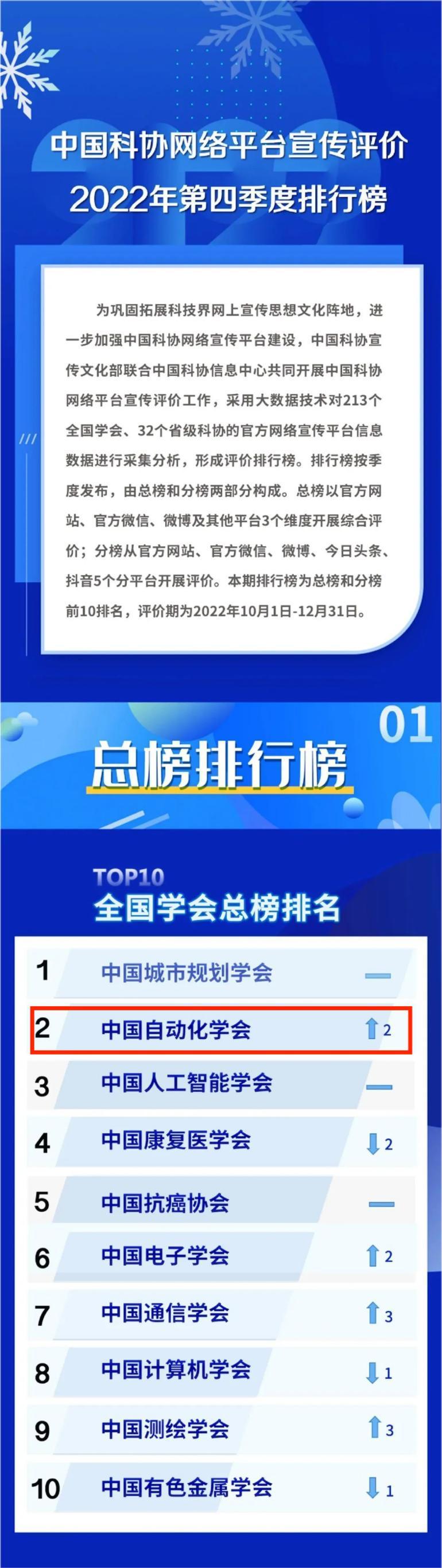 近日,中國科協(xié)發(fā)布網(wǎng)絡(luò)平臺宣傳評價2022年第四季度排行榜。中國科協(xié)宣傳文化部聯(lián)合中國科協(xié)信息中心共同開展中國科協(xié)網(wǎng)絡(luò)平臺宣傳評價工作,采用大數(shù)據(jù)技術(shù)對213個全國學(xué)會、32個省級科協(xié)的官方網(wǎng)絡(luò)宣傳平臺信息數(shù)據(jù)進行采集分析,形成評價排行榜。