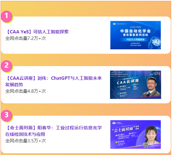 學術無邊界,探索無止境。2023年中國自動化學會線上線下聯動,繼續創辦多元化的CAA線上學術交流活動,加深學術交流。2023年第一季度學會共舉辦CAA云講座5期,會士面對面4期,CAA科普大講堂2期,CAA YeS論壇、我和優博有個約會各1期,邀請了20余位專家學者在線分享前沿學術熱點、最新研究成果、行業應用、學術經驗等內容,不僅得到了廣大科技工作者的廣泛關注與熱情討論,各類線上會議的觀看數量也再次刷新歷史記錄,累計超過70萬人次觀看。