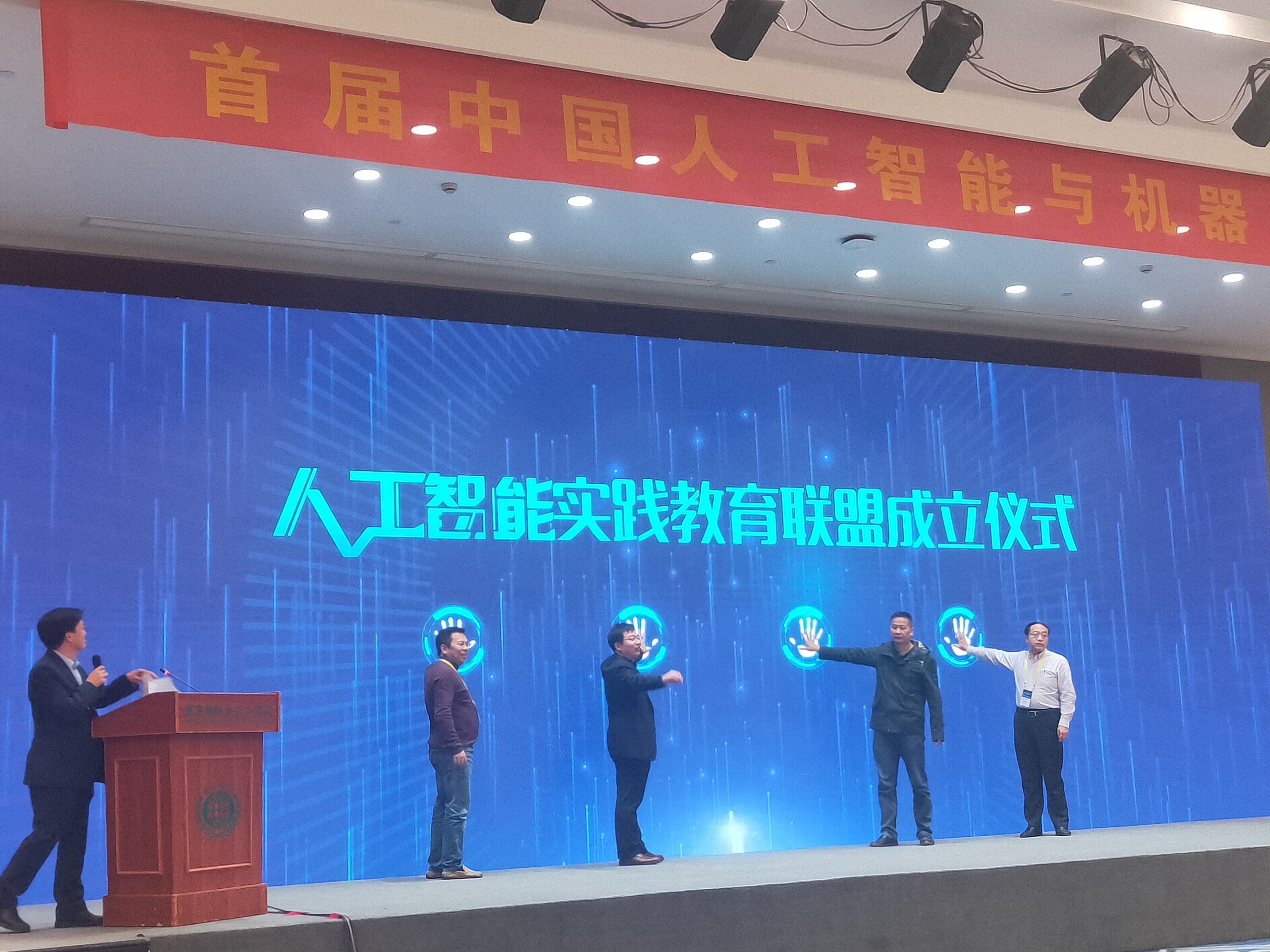接著,大會主席東南大學學習機器研究中心主任孫長銀教授、西普教育董事長王建、廣東工業大學科技與人文研究院院長魯仁全教授和上海工程技術大學電子電氣工程學院院長方志軍教授共同上臺舉行了“人工智能實踐教育聯盟成立儀式”并合影留念。