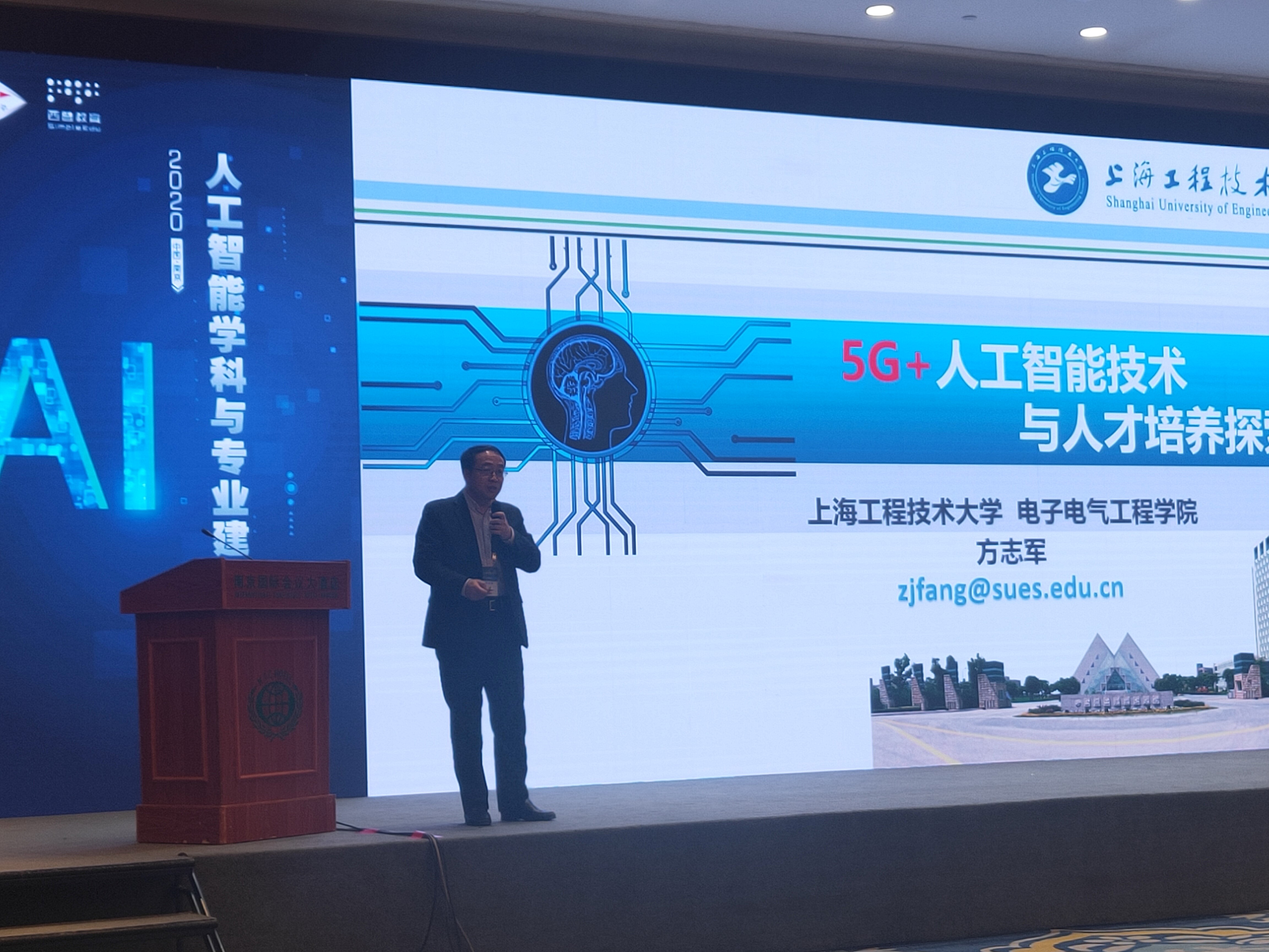 上海工程技術大學電子電氣工程學院院長、人工智能產業研究院院長、智能感知與控制國際聯合實驗室負責人方志軍教授介紹了5G+人工智能技術與人才培養探索。報告圍繞5G傳輸技術、8K編解碼技術與標準、AI發展歷程、基本原理、實踐框架與研究現狀等內容,重點介紹學校在5G+8K+AI組合創新中的戰略布局、已有平臺與主要成果,以及學校在學科建設、專業建設、人才培養等方面的探索。主要包括人臉識別、8K超高清實時傳輸系統、人體姿態估計、全景跟蹤系統、智慧工廠、無人駕駛、無人機巡檢、智慧醫療等5G+人工智能應用場景的技術路線、面臨挑戰與研究趨勢等。