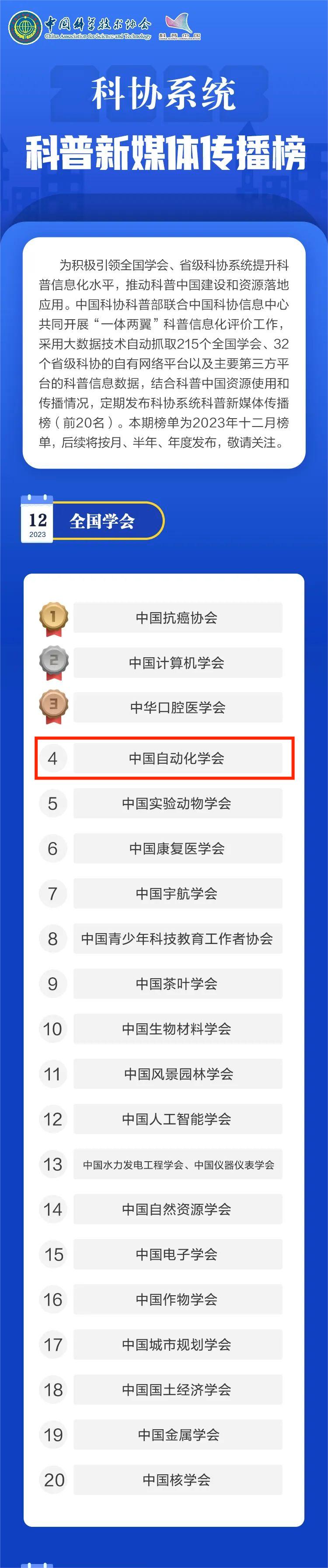 今日,中國科協發布2023年12月科協系統科普新媒體傳播榜。中國科協科普部聯合中國科協信息中心共同開展“一體兩翼”科普信息化評價工作,采用大數據技術自動抓取215個全國學會、32個省級科協的自有網絡平臺以及主要第三方平臺的科普信息數據,結合科普中國資源使用和傳播情況,定期發布科協系統科普新媒體傳播榜(前20名)。