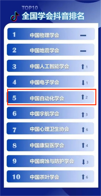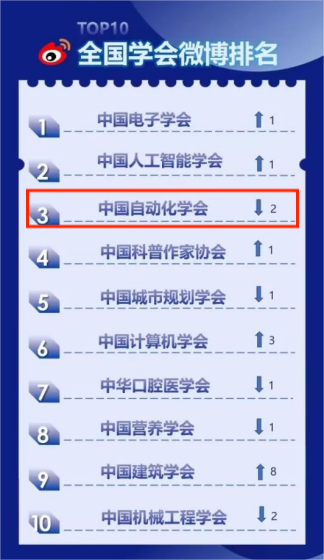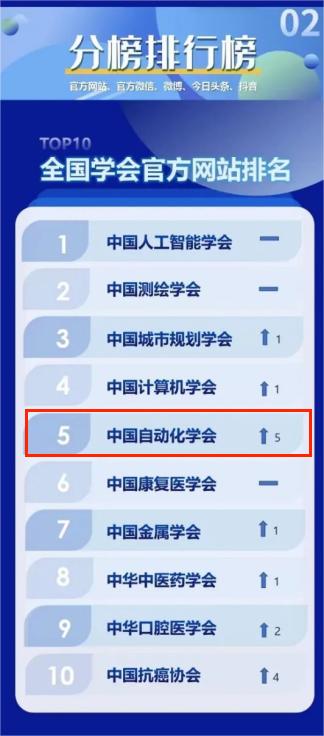中國自動化學會在總排行榜中位列第三,在各大分榜中,學會官方網站和抖音排名第5,微信公眾號排名第4,微博和今日頭條排名第3