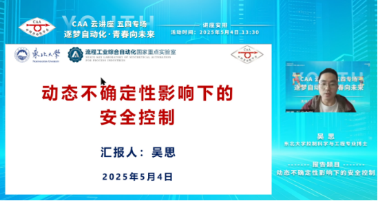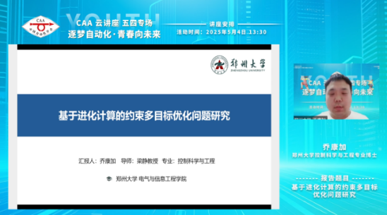 為迎接中國第76個“五四”青年節,2025年5月4日,中國自動化學會舉辦的“CAA云講座·五四專場”活動成功召開,本次活動以“逐夢自動化,青春向未來:青年科技工作者的時代答卷”為主題,共邀請了四名優秀的青年科技工作者,齊聚云端,分享了領域最新研究成果。