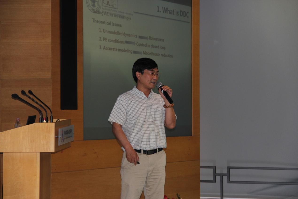 第一天下午第一個(gè)為大家?guī)?lái)報(bào)告的是北京交通大學(xué)侯忠生教授,侯教授為大家?guī)?lái)的報(bào)告題目為“數(shù)據(jù)驅(qū)動(dòng)的自適應(yīng)學(xué)習(xí)控制”。報(bào)告主要分為四部分內(nèi)容,侯教授首先介紹了迭代軸上的學(xué)習(xí)控制和時(shí)間軸上的學(xué)習(xí)控制(即無(wú)模型自適應(yīng)控制),之后主要介紹了學(xué)習(xí)控制的統(tǒng)一框架及主要結(jié)論。