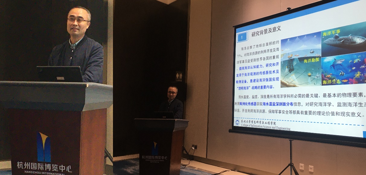 “長江學者獎勵計劃”特聘教授,國家杰出青年基金獲得者,東北大學趙勇教授與與會專家分享了《高分辨力大量程海水溫鹽深光纖傳感方法》的報告。報告聚焦海水溫鹽深剖面測量這一前沿熱點問題,介紹研究團隊利用光纖傳感技術在實現多參數一體化、高分辨力、大量程海水溫鹽深檢測中所做的初步工作,光纖傳感技術具有遠距離在線測量,傳感探頭無需供電,成本低等優勢,可以為海洋參數探測提供一條新的技術路線。