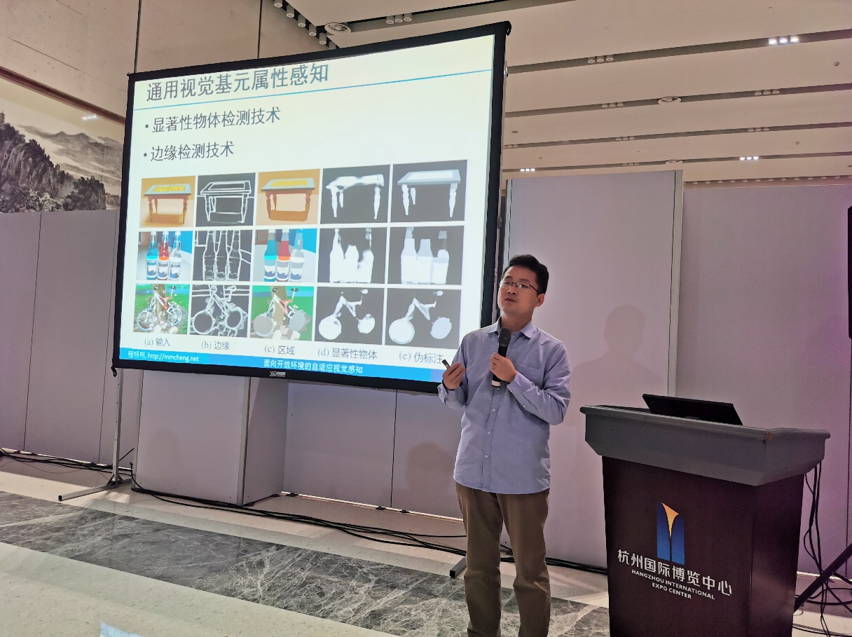 第三位分享嘉賓為南開大學(xué)的程明明教授,他的報告題目是“開放環(huán)境下的自適應(yīng)視覺感知”。現(xiàn)有機(jī)器視覺學(xué)習(xí)方法依賴大規(guī)模精確標(biāo)注的訓(xùn)練樣本。實踐表明,在典型實驗室環(huán)境下設(shè)計和訓(xùn)練的人工智能模型,在行業(yè)應(yīng)用場景變換時,容易導(dǎo)致系統(tǒng)性能急劇下降。面向智能系統(tǒng)的自主發(fā)育,程明明教授從弱監(jiān)督視覺理解的角度分享了如何降低深度學(xué)習(xí)模型對特定應(yīng)用場景數(shù)據(jù)依賴的研究進(jìn)展,集中展示了高效視覺特征提取與魯棒深度學(xué)習(xí)模型集成方法、基礎(chǔ)通用視覺屬性學(xué)習(xí)方法、基礎(chǔ)通用視覺知識引導(dǎo)的弱監(jiān)督學(xué)習(xí)模型構(gòu)建方法、以及基于互聯(lián)網(wǎng)數(shù)據(jù)的自主知識學(xué)習(xí)方法。