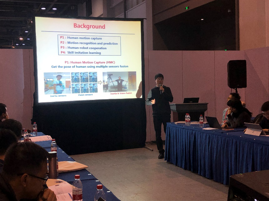 浙江工業大學張文安教授針對人機協作系統中的多傳感器信息融合估計問題進行了報告。針對現存傳感器的問題,利用新的自適應算法改善慣性傳感器延時,對干擾信號進行隨機過程建模并補償,以此彌補慣性傳感器的漂移。之后融合視覺和慣性兩類信息計算出描述目標姿態的69維向量,完成目標準確識別。在此基礎上將識別得到的目標姿態信息作為輸入傳送給機械臂,可實現對機械臂的遠程協作操控。最后介紹團隊將在力信號學習、機械臂柔性設計等方面繼續研究。