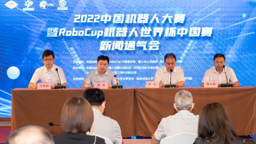 2022年9月26日,由中國自動化學會、RoboCup中國委員會、晉江市人民政府、泉州市科學技術局主辦,中國自動化學會機器人競賽與培訓部、中國自動化學會機器人競賽工作委員會、中共晉江市委人才辦、晉江市科學技術局共同承辦的“2022中國機器人大賽暨RoboCup機器人世界杯中國賽新聞通氣會”在福建省泉州市晉江市佰翔酒店舉行。大賽同時得到了中國自動化學會智能自動化專業委員會、泉州湖南大學工業設計與機器智能創新研究院等單位支持。