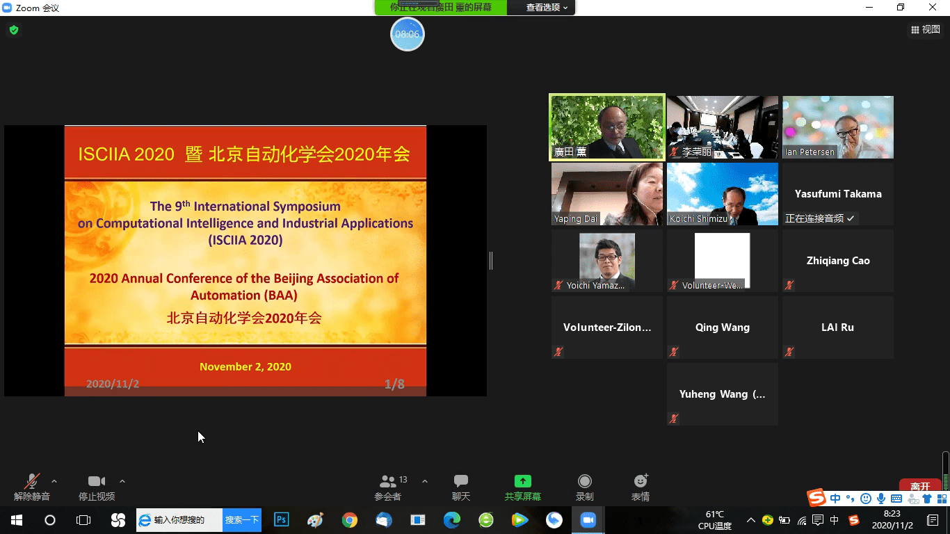 第9屆國際計算智能與工業應用研討會(The 9th International Symposium on Computational Intelligence and Industrial Applications, ISCIIA 2020)暨2020年度北京自動化學會學術年會于2020年11月1至2日在北京西苑飯店成功舉行。會議由北京自動化學會、北京理工大學、國際模糊系統協會(IFSA)、日本模糊論與智能信息學學會(SOFT)、日本學術振興會(JSPS)等機構主辦,由日本富士技術出版有限公司協辦,并得到了中國科協和北京市科協的支持。受疫情影響,會議采用了線上和線下混合辦會模式,中國、日本、加拿大、澳大利亞、英國等國家的近200位學者參與了本次會議,圍繞計算智能及應用的主題進行了廣泛的交流與探討。在物聯網、云計算和大數據等新興領域的推動下,計算智能作為實現智能化的重要技術被推到了學術界和產業界的前沿。本屆會議旨在匯聚全球在計算智能等相關領域研究者和從業者進行成果展示和學術交流。