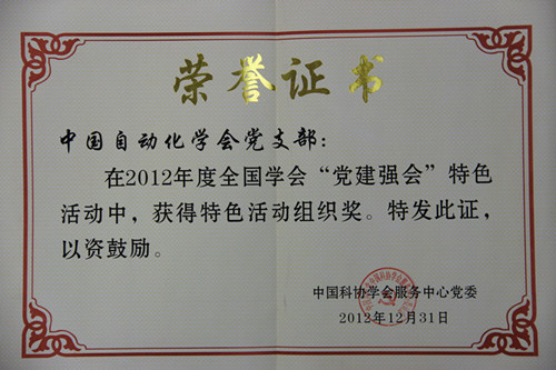 會上,中國自動化學會黨支部堅持黨建強會,扎實履行學會工作職能,以優異的工作成績獲得“學會黨建特色活動組織獎“,受到中國科協表彰。
