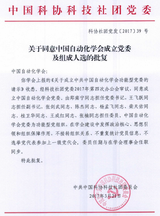 近日,中國科協同意并批復了中國自動化學會關于成立中共中國自動化學會功能型黨委的請示。