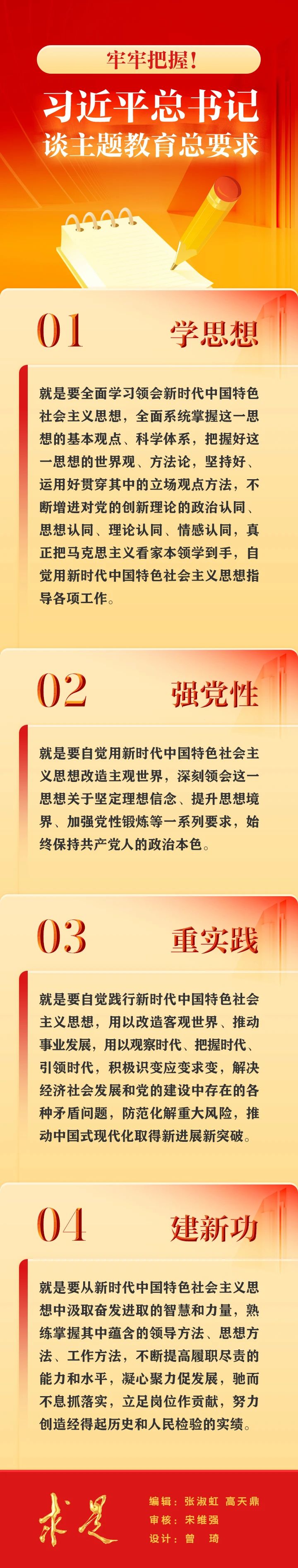 在2023年第9期《求是》雜志刊發的習近平總書記重要文章《在學習貫徹習近平新時代中國特色社會主義思想主題教育工作會議上的講話》中,總書記強調要“牢牢把握總要求”,“把這一總要求貫穿這次主題教育全過程”。