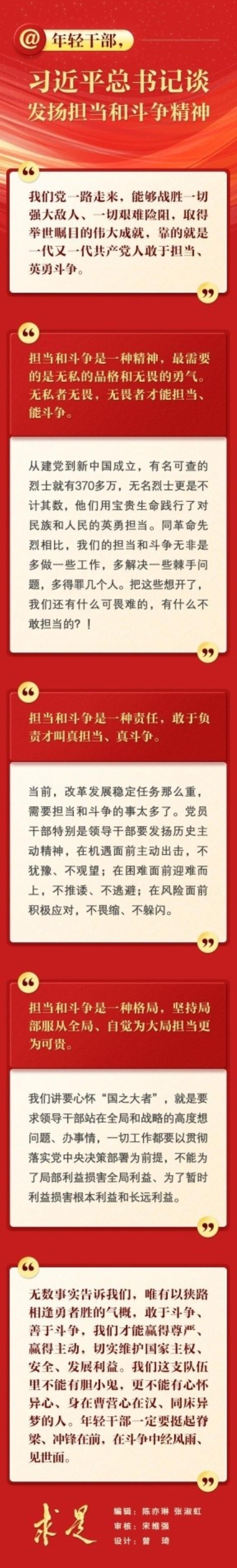 在2023年第13期《求是》雜志刊發的習近平總書記重要文章《努力成長為對黨和人民忠誠可靠、堪當時代重任的棟梁之才》中,總書記深刻闡釋“擔當和斗爭精神”,強調“只有全黨繼續發揚擔當和斗爭精神,才能實現中華民族偉大復興的宏偉目標”,“年輕干部一定要挺起脊梁、沖鋒在前,在斗爭中經風雨、見世面”。