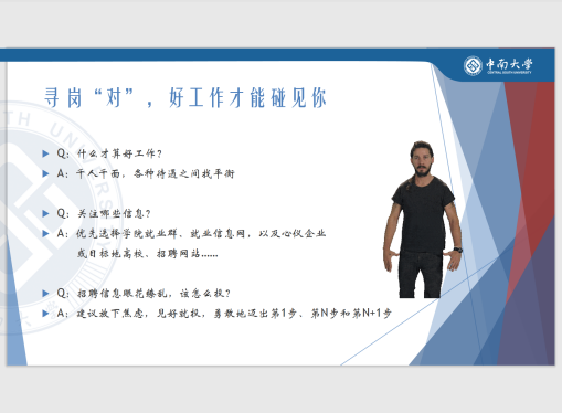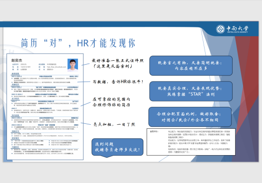 最后,同樣是中南大學2025屆畢業生的趙奕杰同學從找崗位、寫簡歷、去面試三個方面來為同學們詳盡介紹,并舉了一些正面和方面例子,言簡意賅,讓同學們收獲頗豐、受益匪淺。