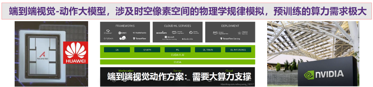 端到端的視頻動作解決方案對數據的需求極其高,需要大量的短視頻和動作數據來進行有效的訓練。這種解決方案的實現依賴于極大的AI算力,特別是在聯合預訓練階段。在這一階段,通常需要百萬量級的短視頻數據。短視頻因其信息量大且重復較少,適合用于大規模數據處理。預訓練階段是最為算力密集的,因為涉及到處理大量數據并建立初步模型。